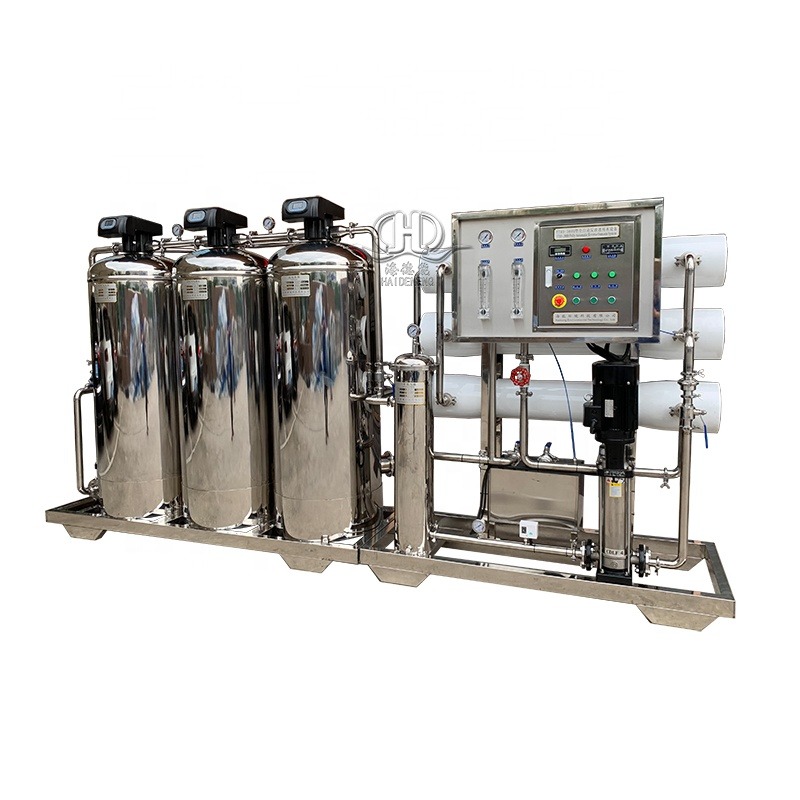 Reverse osmosis, the raw water, first goes by pre-treatment, then by RO treatment. Through those treatments, can remove dissolving salt 99% and harmful materials, like particle, colloid, organic impurities, heavy metal ions, bacteria, viruses and heat source, etc. the system salt rejection rate gets 96-98%, outlet water conductivity gets ≤10μs/cm².